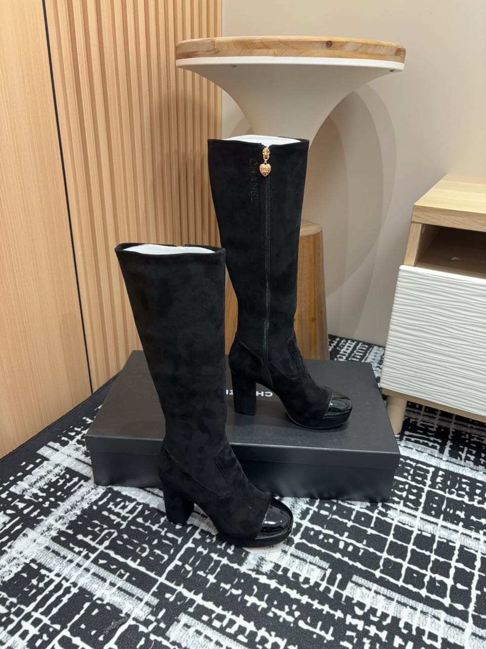 CC high boots | black suede with patent leather cap toe and chunky heels.